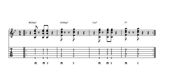El primer ejercicio consiste en tocar una progresión básica de acordes IMaj7, IVMaj7, ii-7, V7 atacando en cada tiempo del compás. Haremos un rasgueo con púa descendiente que durará una corchea, y seguidamente mutearemos las cuerdas con un pequeño movimiento alzando ligeramente nuestra mano izquierda, de modo que sin sacar los dedos de las cuerdas, conseguiremos silenciar el sonido del acorde. Con este ejercicio y a base de metrónomo, tendremos que llegar a que nos funcione la mano derecha con regularidad y a tiempo, subiéndolo de forma progresiva y además, para los que no estén muy habituados al uso de éstos acordes, os facilitará el reconocimiento y la práctica de los mismos.
